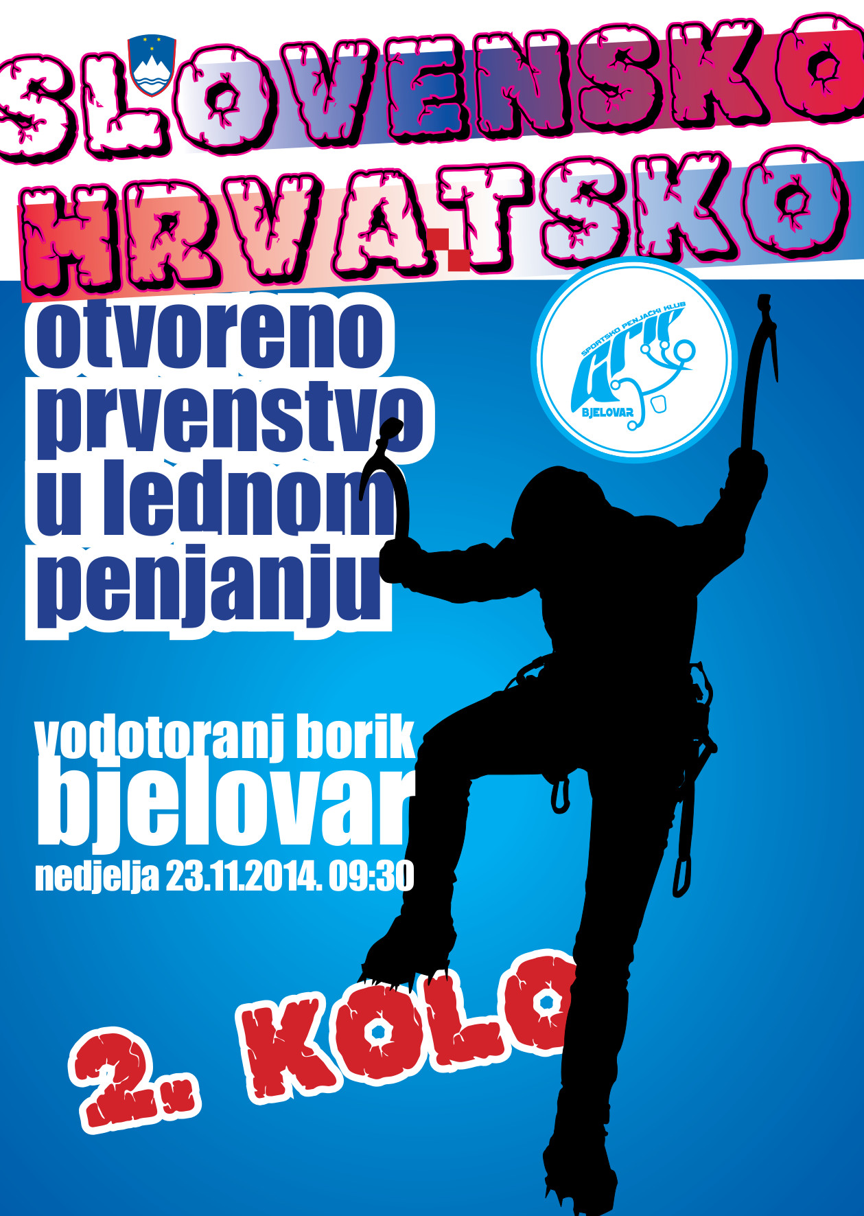 Veliko nam je zadovoljstvo najaviti održavanje 2. kola slovensko-hrvatskog otvorenog prvenstva u lednom penjanju (bivši Ledni kup) za sezonu 2014./2015. u Bjelovaru, u nedjelju 23.11.2014. godine!